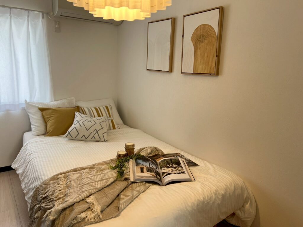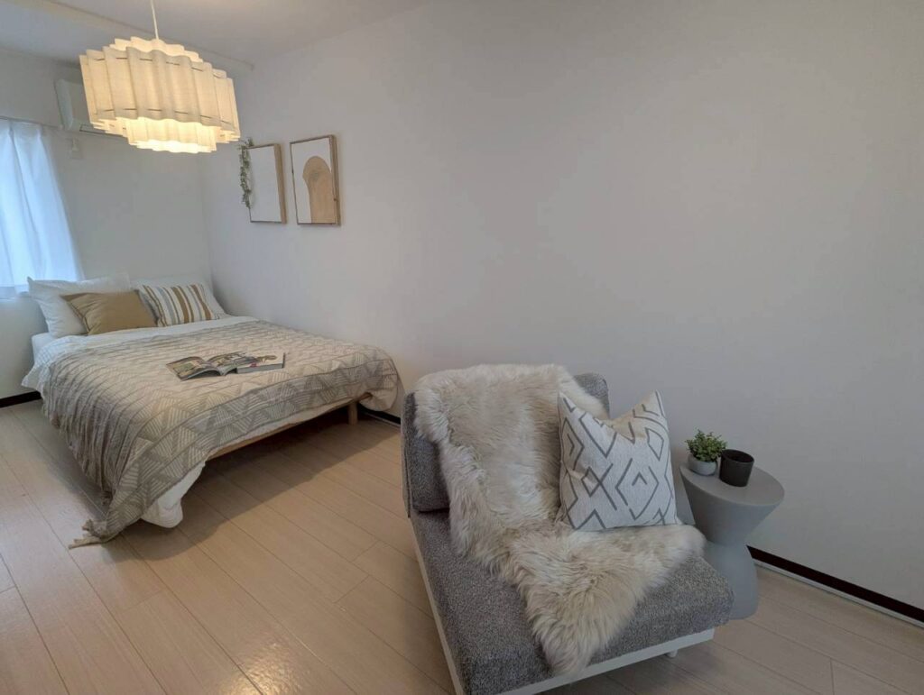 花柄やピンクを基調とした女性的な印象の強いお部屋を、より多くのゲストに選ばれやすい空間にしたいという民泊オーナー様のご要望から、インテリアの模様替えを行いました。